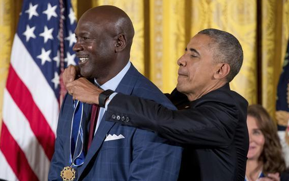 “今年这批(接受总统荣誉勋章的)人士特别让人印象深刻。”奥巴马说道,“我们看到了有创新者、艺术家、公务员、政届领袖、运动员以及塑造著名角色的演员,比如那个来自电影《空中大灌篮》的家伙。”
