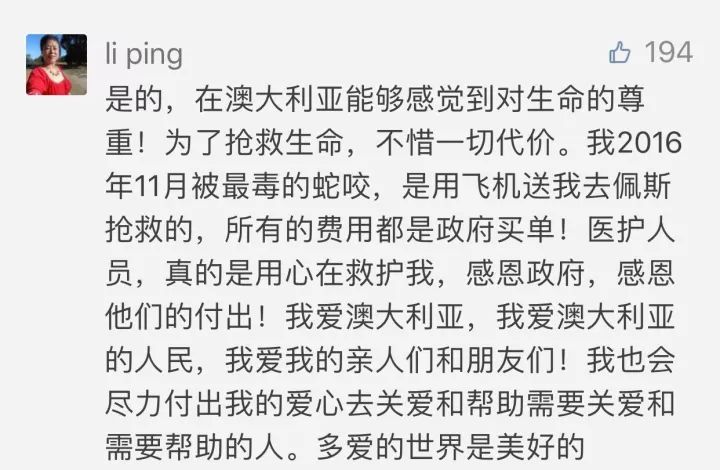 在澳大利亚能够感觉到对生命的尊重!为了抢救生命,不惜一切代价。我2016年11月被最毒的蛇咬,是用飞机送我去佩斯抢救的,所有的费用都是政府买单!医护人员,真的是用心在救护我,感恩政府,感恩他们的付出!我爱澳大利亚,我爱澳大利亚的人民,我爱我的亲人们和朋友们!我也会尽力付出我的爱心去关爱和帮助需要关爱和需要帮助的人。