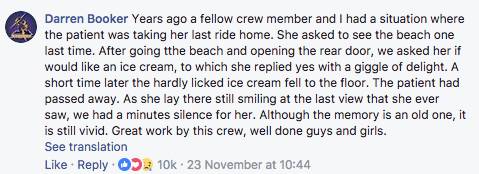 几年前,我和我的一位同事也照顾过一位病人,在我们载她回家的路上,她问我们能不能最后带她去一次海边。