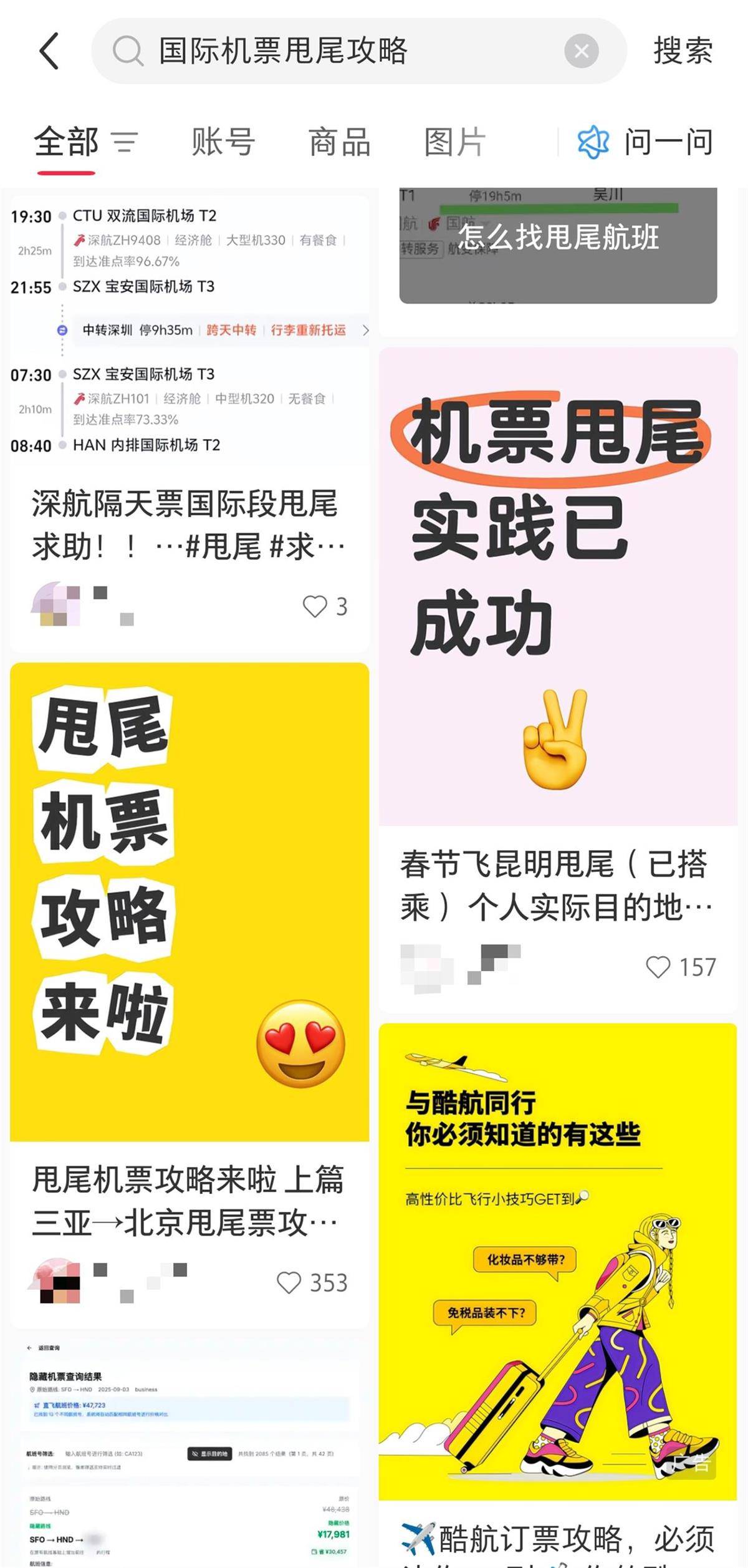 网友在社交平台分享机票甩尾攻略