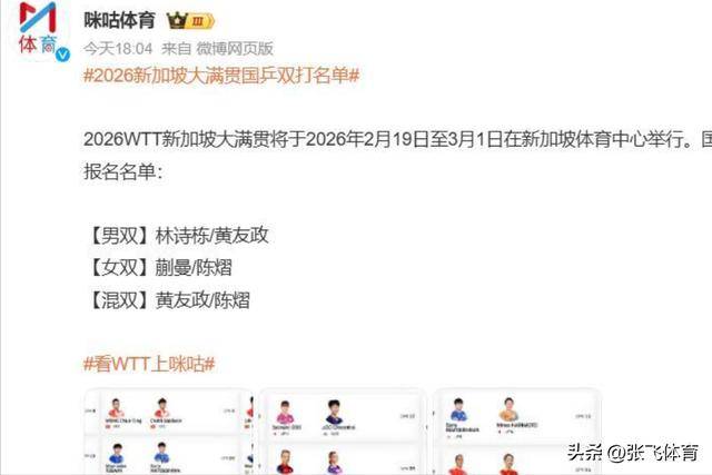 多哈比赛结束不到两天,WTT公布了新加坡大满贯赛的双打参赛名单。