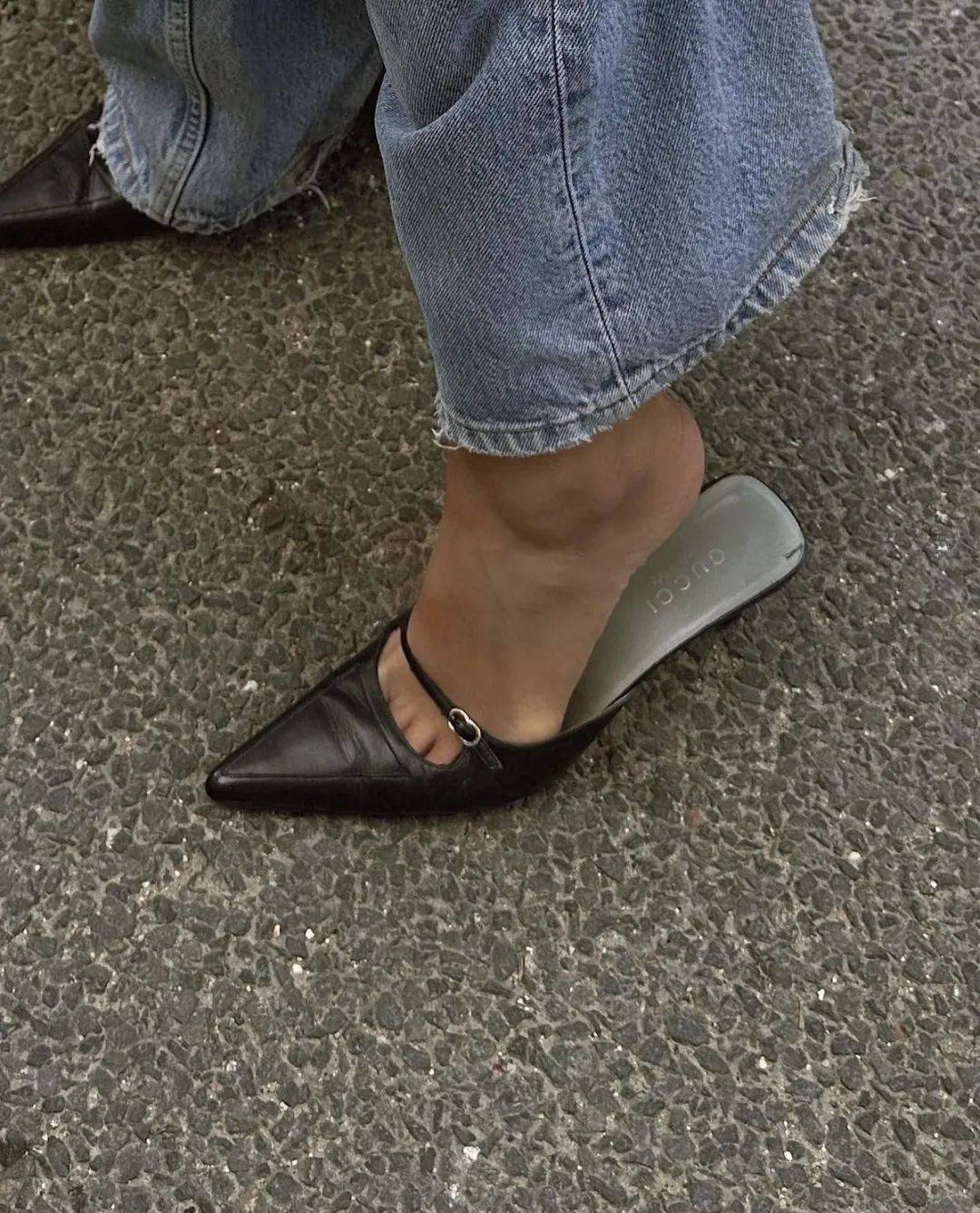 尖头凉拖鞋不像其他凉拖那样完全开放,而是在露出脚背的同时,收住了脚趾的轻浮感。