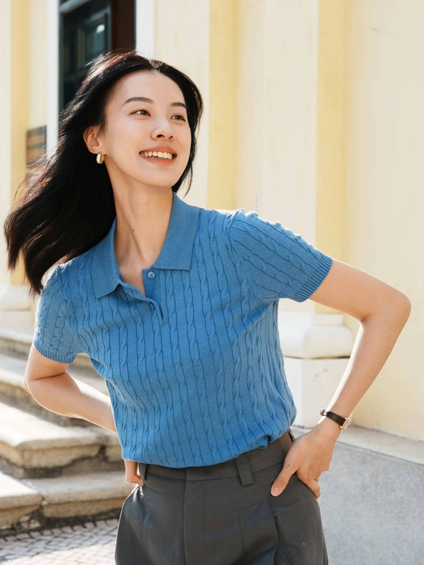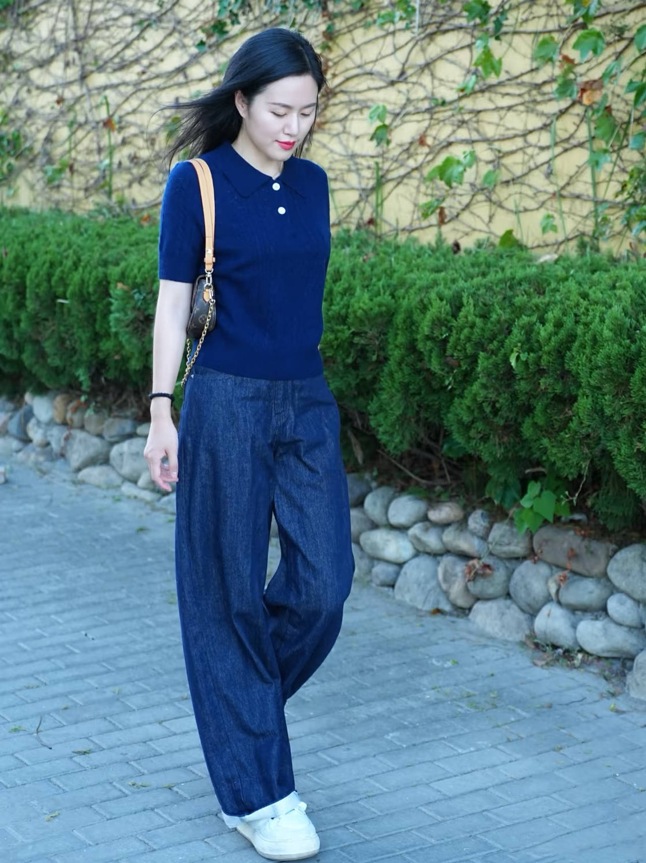 阔腿裤对腿型的包容性很强,只要版型合身且面料垂感佳,搭配POLO衫基本都不会出错。重点在于上半身细节拿捏,可以适当解开衣领的几个扣子,增加脖颈露肤拉长脖颈线条,小V领效果配合手臂留白,配合阔腿裤整体身形显得更加轻盈修长,即便是身高不是很出挑,也能轻松穿出轻盈显高的效果。