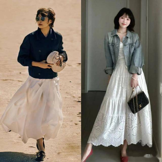 短外套+赫本裙 如果天气有些凉,我们可以选择短款外套与赫本长裙的搭配,既温柔有女人味,又很保暖。 磨白的牛仔短外套,有一种硬朗帅气的风格,当它遇上白色的赫本裙,增加了清纯温婉的质感,很小仙女的样子。