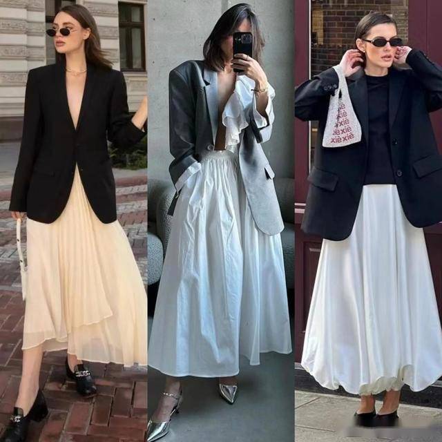 日常通勤,挺括严肃的西装可以搭配温柔的赫本裙来穿,既知性优雅,又多了一些时髦女人味。 黑色西装搭配白色赫本裙,硬朗中带着轻盈感,配色简洁干净,又高级又很显气质。