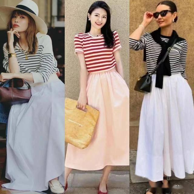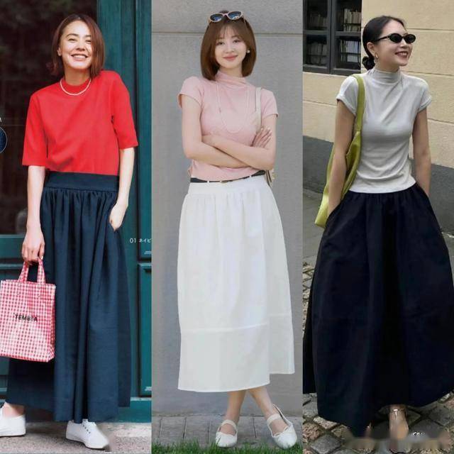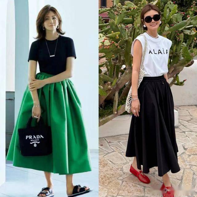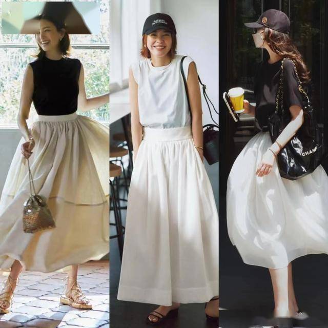 T恤+赫本裙 T恤衫是夏天最经典的基础款了,当它遇上优雅的赫本裙时,立马显得不再普通,给人一种轻松又温柔的风格。 简单的白T或是黑T,可以搭配白色的赫本裙,简约而不简单,轻盈飘逸中透着青春的美,减龄耐看。