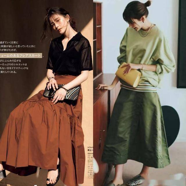 黑色T恤衫,修身一些更显瘦,搭配苹果绿色的赫本裙,配色典雅复古,带着些法式的风格,有种电影感,特别适合成熟女生穿,有种小女人的妩媚与温柔。