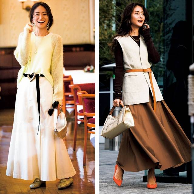 深棕色长袖内搭打底,外搭米白色无袖马甲,简约大气;腰间橙色皮带横向点缀,巧妙划分身形比例,为造型注入活力。下身搭配棕色大裙摆长裙,行走间尽显飘逸感。脚上橙色尖头高跟鞋与腰带色彩呼应,成为视觉亮点。