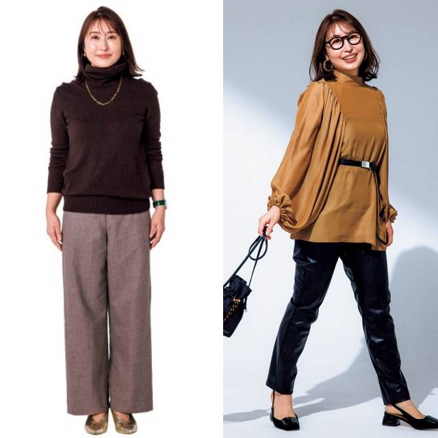 深棕色高领毛衣,深色基调,米灰色阔腿裤,脚上搭配金色鞋子,整体沉稳色调,但过于标准化。