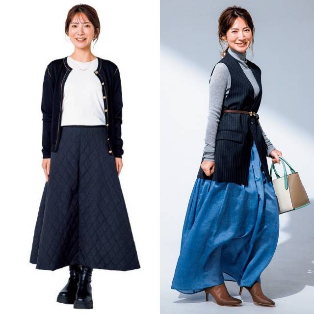 同样大裙摆,上身内搭紧致的浅灰色高领长袖打底衫,外搭增添利落感的马甲,腰间棕色皮带勾勒腰线,强化比例感。蓝色飘逸长裙,材质轻盈,大裙摆营造浪漫氛围。脚上棕色高跟鞋,细跟设计提升优雅气质,与腰带颜色呼应。整体风格融合干练通勤与柔美优雅,展现多元时尚魅力。