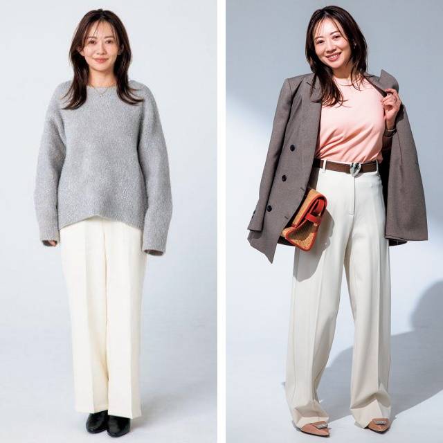 同样一条白色裤子,上衣内搭浅粉色,外搭米灰色双排扣西装,剪裁利落,尽显大气风范。腰间棕色腰带巧妙勾勒腰线,增添造型层次。脚上搭配浅色调鞋子,前端精致装饰细节感拉满。