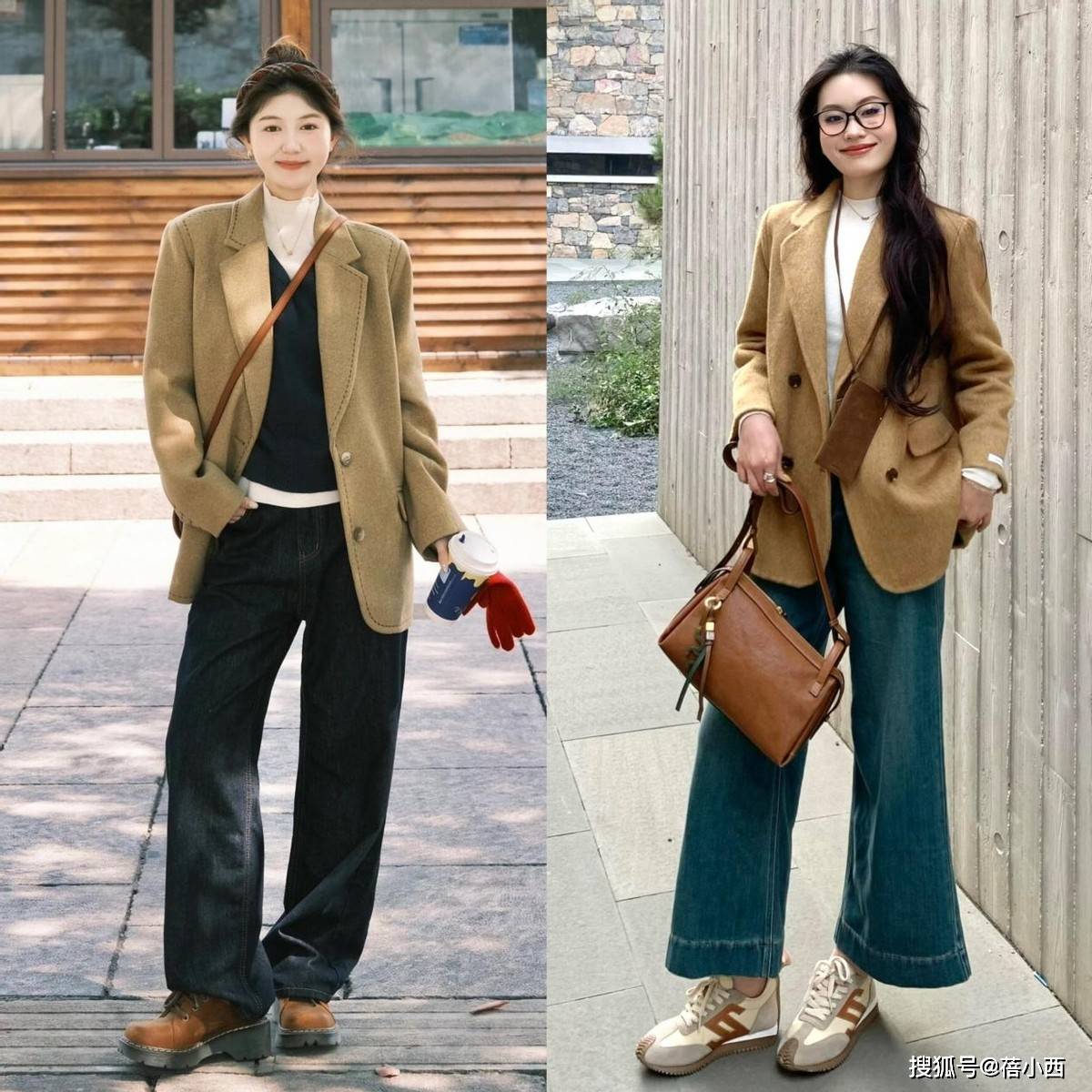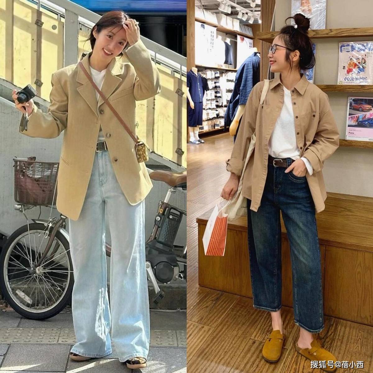 姐妹们可以在上半身穿上一件卡其色的西装外套,搭配牛仔阔腿裤,整体搭配风格立马变得随性慵懒,很适合日常逛街的时候穿。