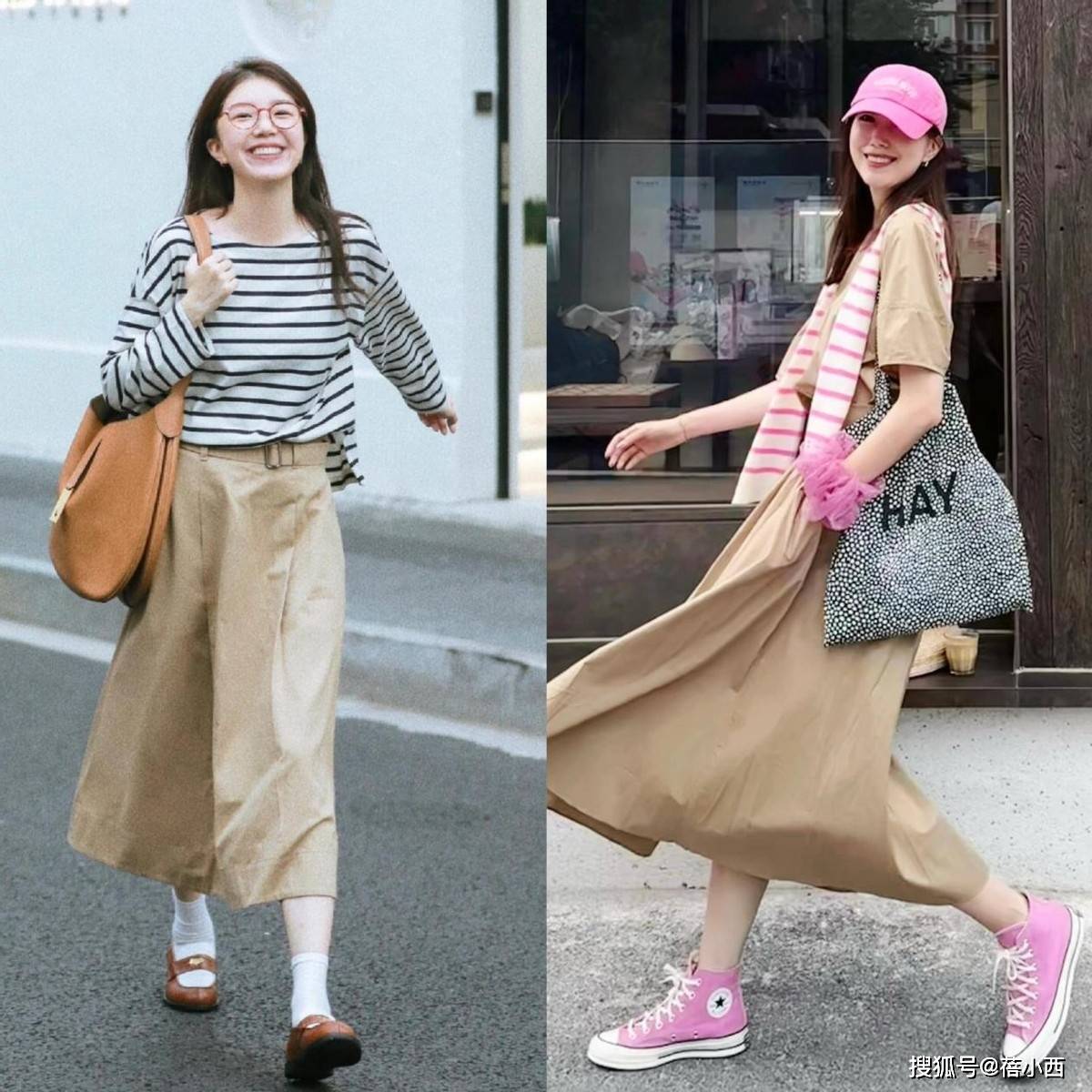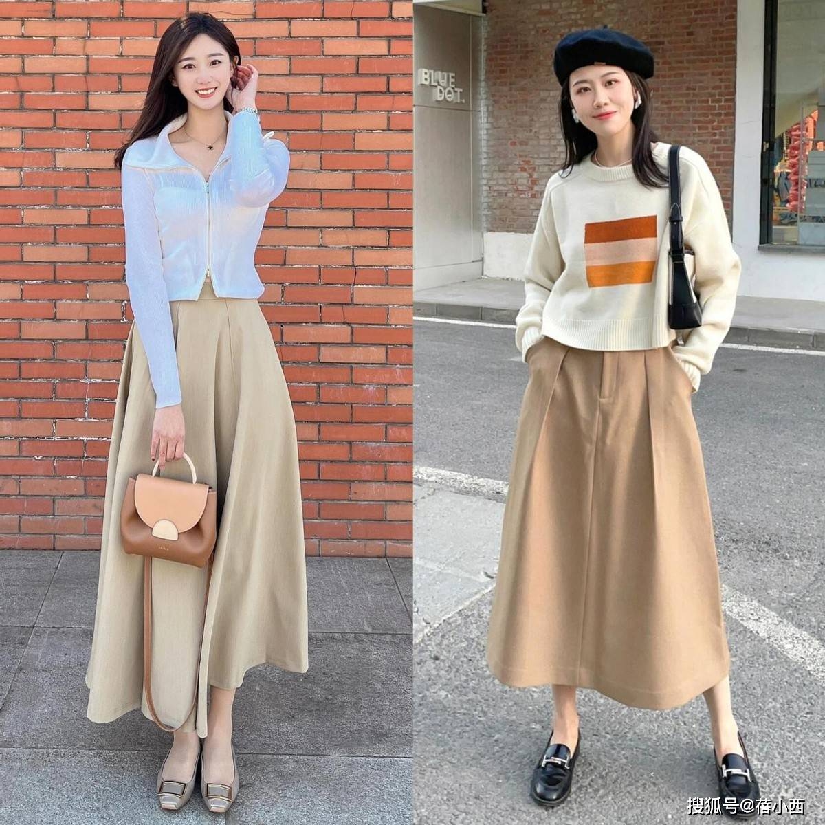 卡其色A字半身裙是减龄的必备单品,它的裙摆微微散开,能够很好地修饰胯部和大腿线条,展现出俏皮可爱的少女感,搭配针织衫,又显得很温柔。