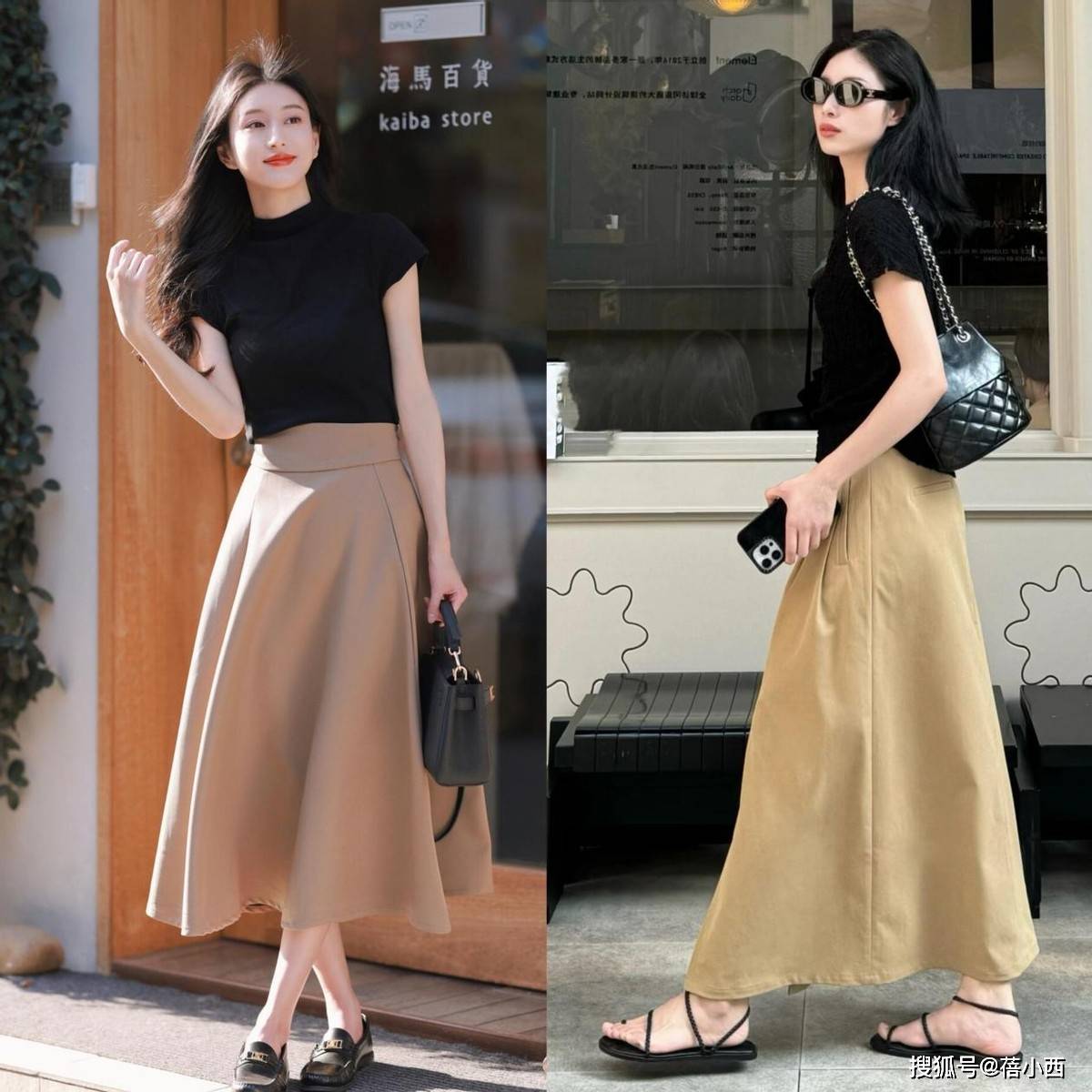 黑色的短袖搭配卡其色的半身裙,通过这种经典的配色,也可以体现高级感,短袖塞进半身裙,立马调整比例,谁穿谁是大长腿,并且全身的配色不过3,这种极简的配色更是极具高级感。