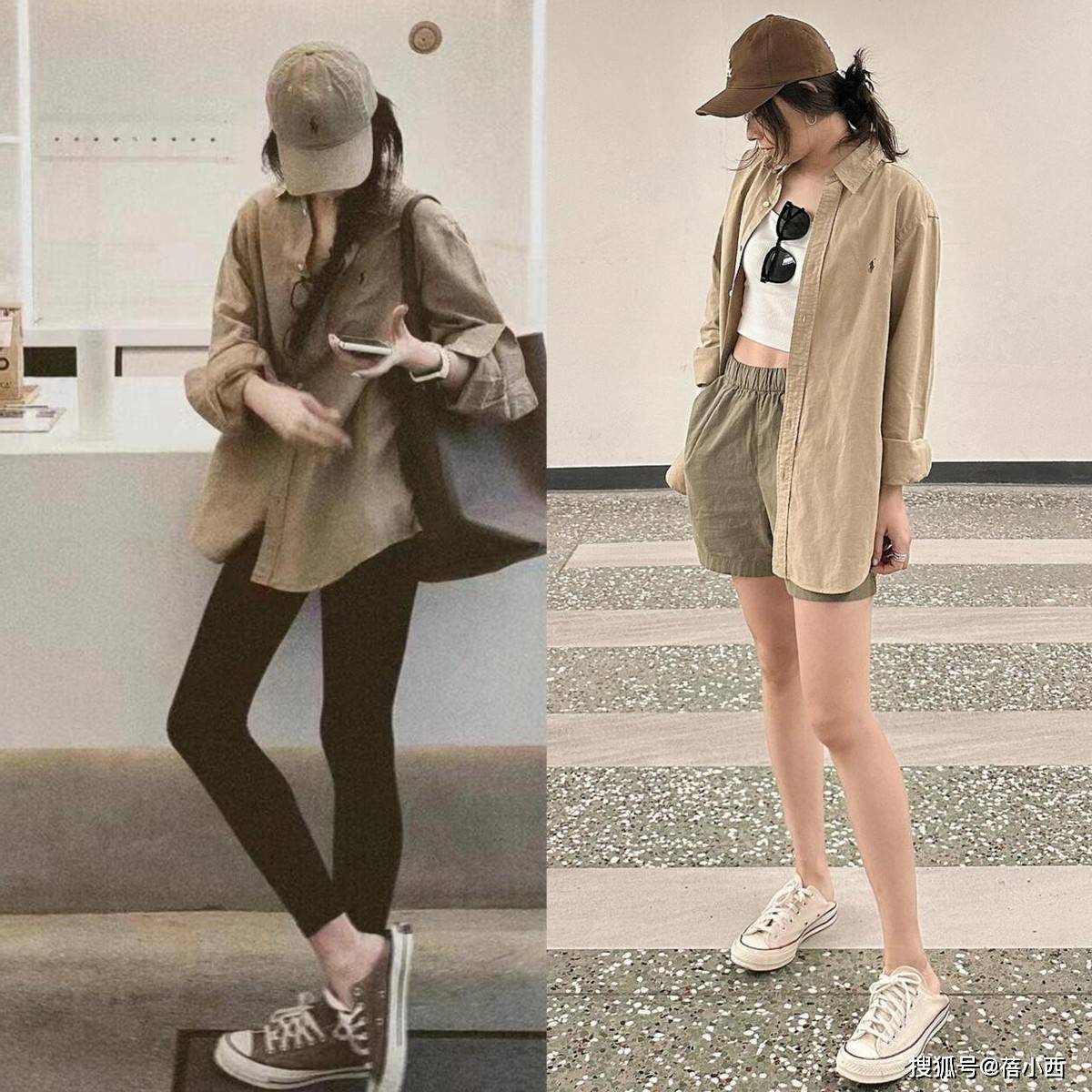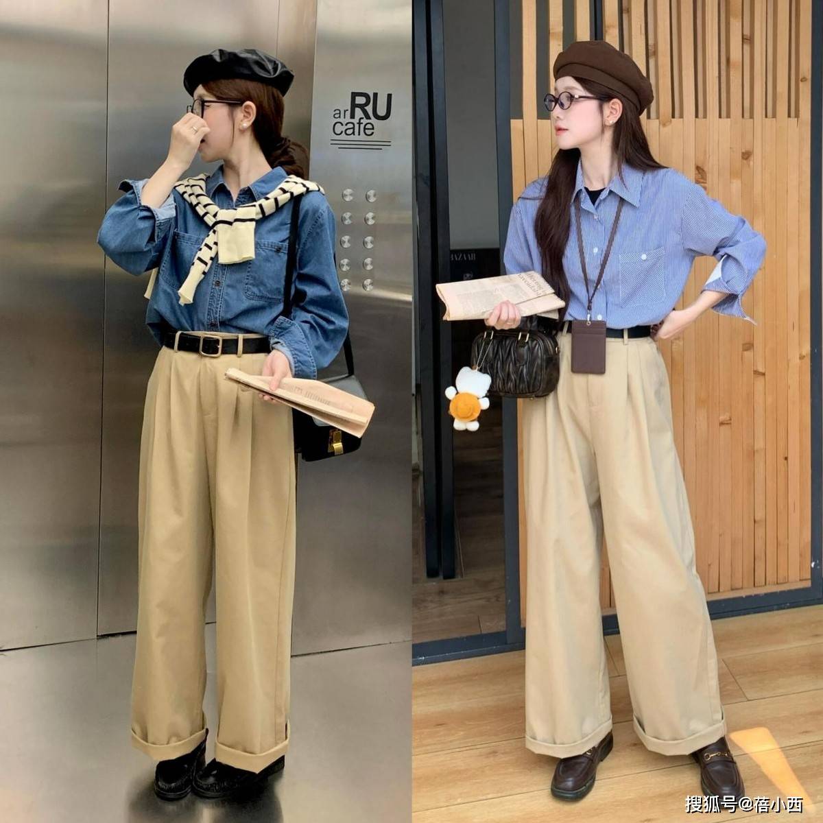想要搭配的更加清爽,姐妹们可以尝试蓝色衬衫和卡其色阔腿裤的结合,这种配色利用了冷暖结合的思路,有利于改善我们的肤色,视觉上非常的显白哦。