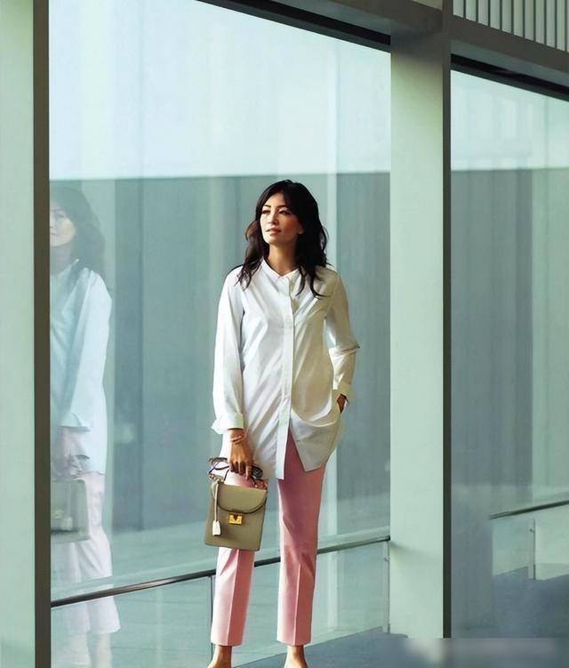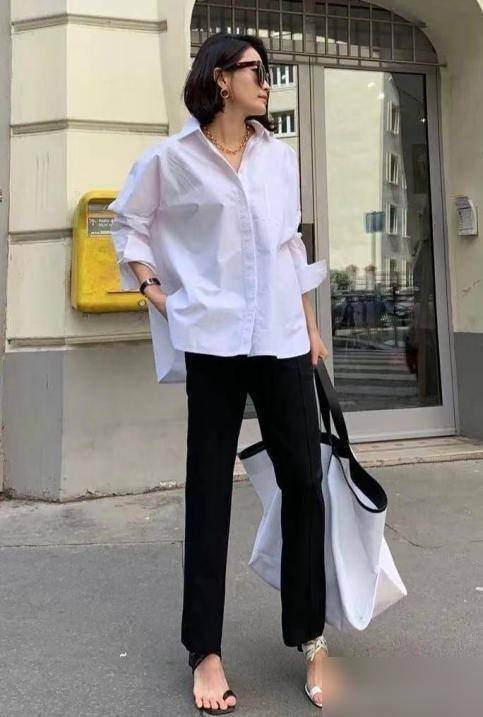 其次,衬衫也是一种可以跟直筒裤进行自由搭配的上衣,选择一款白色或者弃色系简单纯色衬衫,会给人一种干练精致的感觉。