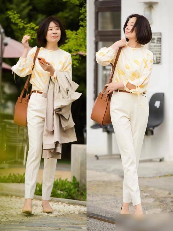 如果在夏季穿着,可以选择一条白色或米色轻薄透气面料做成的直筒裤,搭配一款印花设计简单清新的T恤,上身看起来也会十分舒适凉爽。