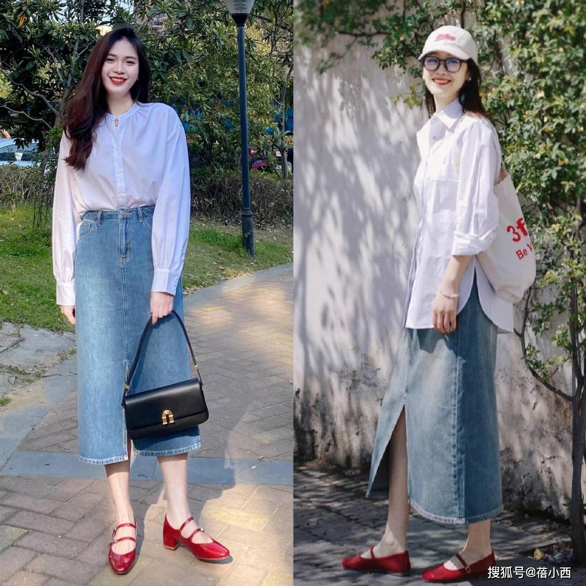 牛仔的半身裙充满休闲感,直筒的版型更是有利于修饰我们的身材,这个时候搭配平底小红鞋,和半身裙的颜色形成反差感,立马就可以提亮你的造型,冷暖结合,轻轻松松避免单调。