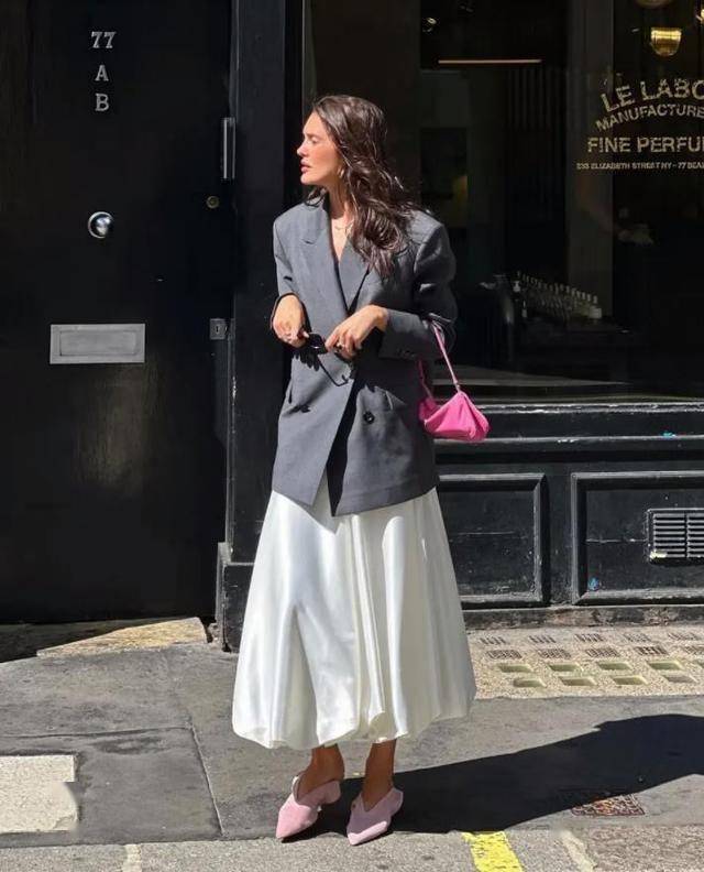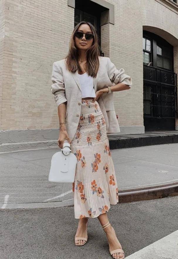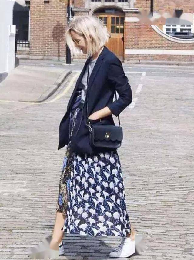 西装外套好像一直都是时尚圈里的潮儿,从一开始只属于职场,到后来慢慢被众多街拍博主们青睐,卡其色的西装搭配碎花半裙,春日感直接拉满。不过在选择裙子时,颜色建议与西装颜色接近,这样能起到一个很自然的过渡,整体瞧着也会和谐很多。