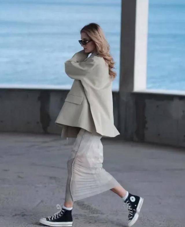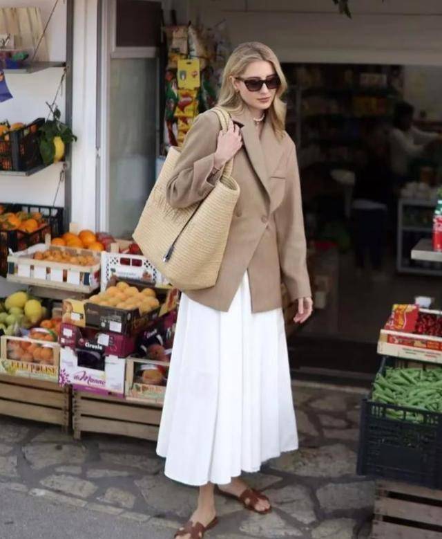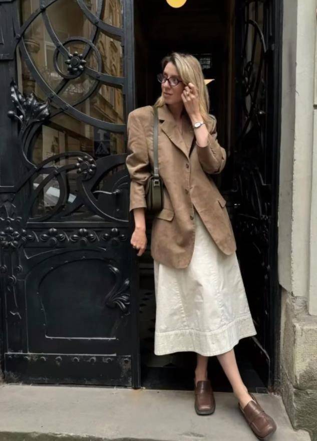 当然了,对于喜欢穿裙子的女性而言,白色裙子会是这个色调西装的最佳选择,卡其色西装和白色长裙的搭配,显得格外雅致高级,也为春日的穿搭带来一股清新感。
