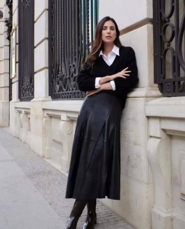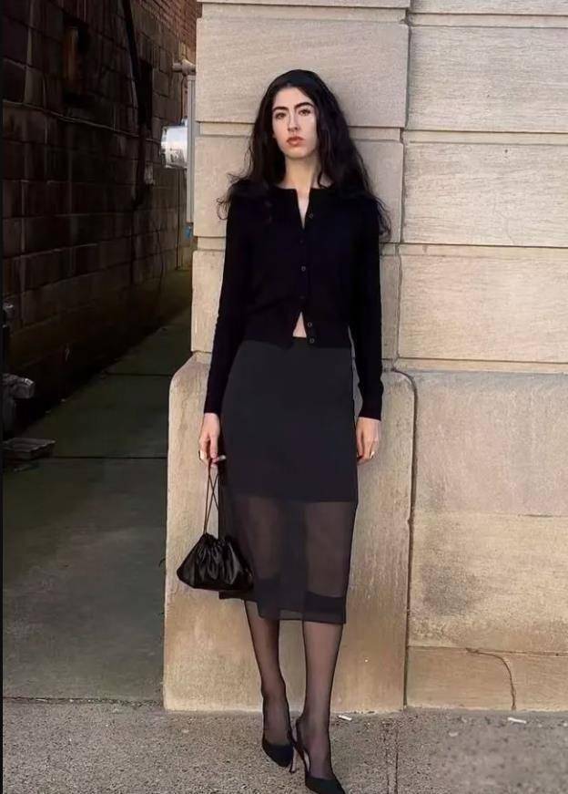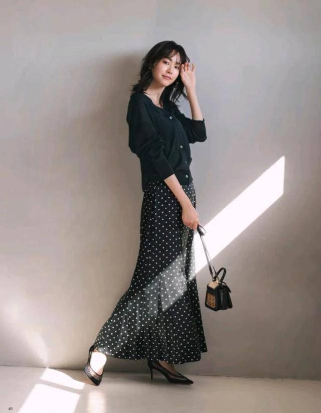 黑色针织小开衫+黑色波点半身长裙,整个穿搭上多了点细节,也因为波点元素让穿搭看起来更灵动,还带点复古气息。