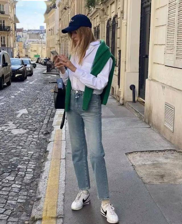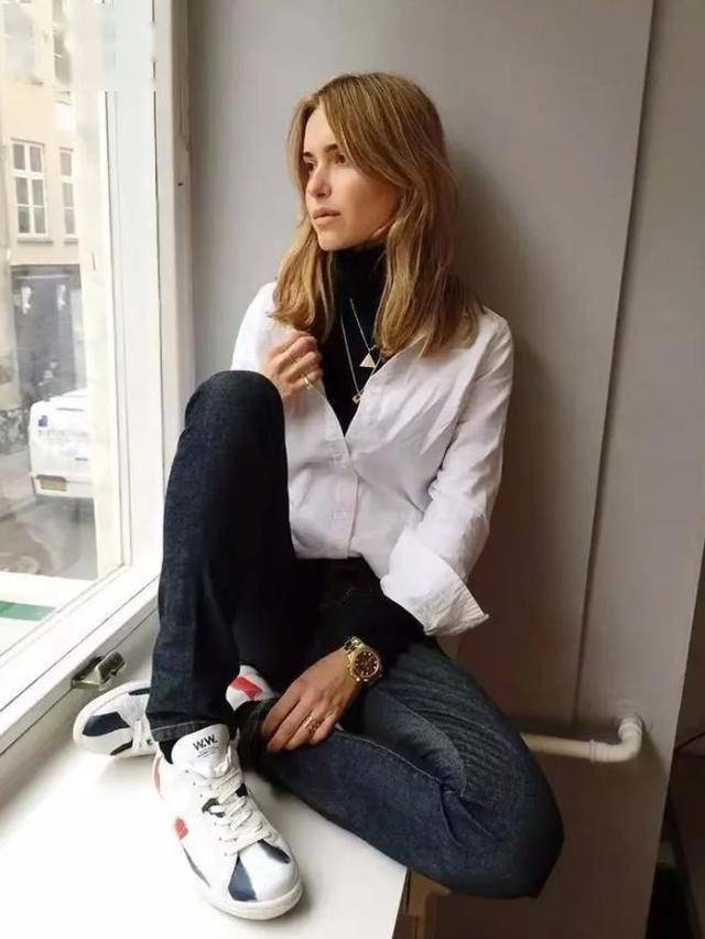 干净简单又显气质,这样的白衬衫谁会不喜欢呢?春天就是适合利用白衬衫配黑色高领打底,叠穿最能增加层次感,又保证了一定的温度,再配上一条深蓝色牛仔裤,加上双运动鞋,简单的时髦感。