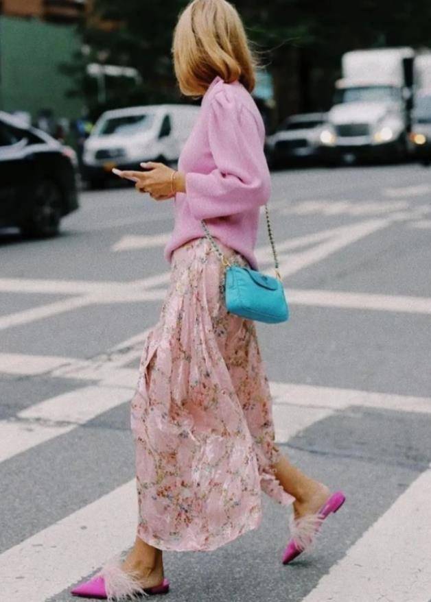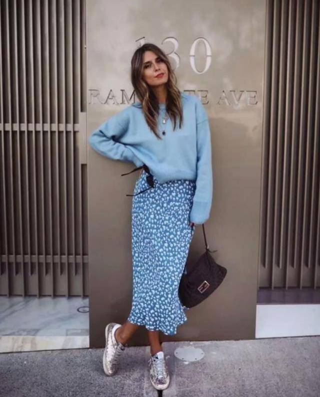 春天利用薄毛衣或者是针织衫来搭配碎花长裙,一简一繁的组合,既不失细节感又不会让人看起来很花哨,整体的配色遵循同色就更简约和谐了。