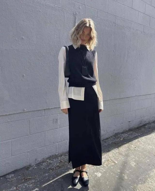 白色衬衫叠穿针织马甲可以说是很经典耐看的组合了,略显层次感,简单利落,又赋予穿搭一种文艺气息,下装搭配裙子和裤装都很好看。