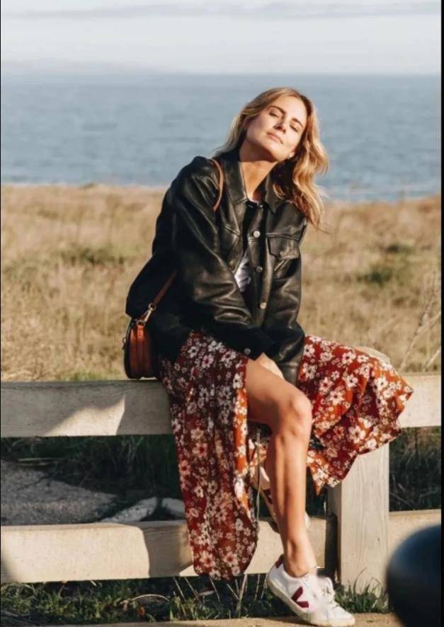 酷酷的黑色皮衣,搭配一条红色碎花长裙,这样的混搭简直美炸了,裙子的温柔浪漫很好弱化了皮衣的硬朗,轻松让你穿出刚柔并济的美。