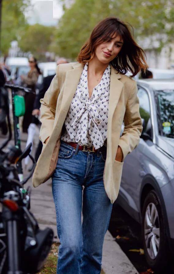 春天就是适合穿西装,特别是卡其色,因为这个色调很符合春日的柔和氛围感,温和低调的卡其色西装,比起沉闷严肃的黑色好太多了。而且这个色调也比较符合时下流行的的复古风潮,内搭一件飘带衬衫,下身配一条牛仔裤,优雅复古,老钱风那味有了。