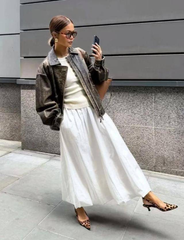 在春天里穿西装外套或是皮衣,如果想要配裙子,那么可以试试白色长裙,不管是缎面裙,还是棉质的白长裙,都能让你的造型变得优雅清爽起来,春天气息满满。