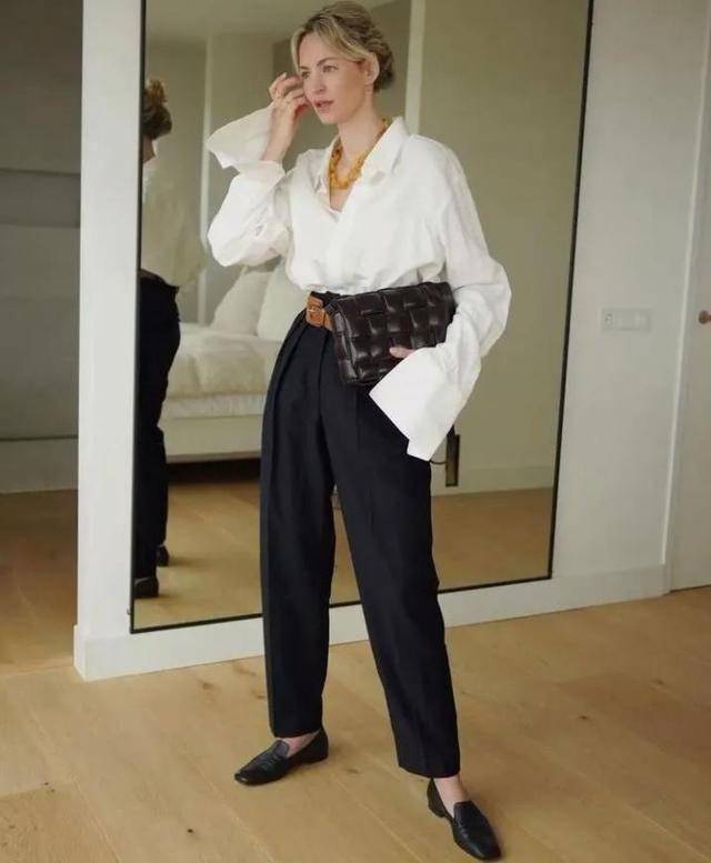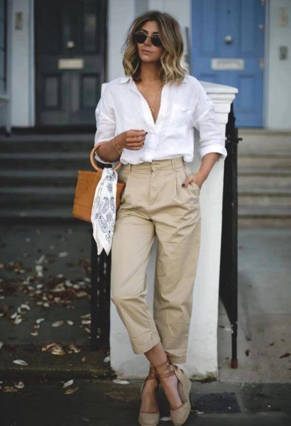 等到天气变得暖和一些的时候,就可以单穿一件白衬衫出门了,搭配黑色西装裤或卡其色裤,再加上一双乐福鞋,简单干净又显气质,适当佩戴一些饰品来点缀,如金色的项链,这样的造型精致高级。