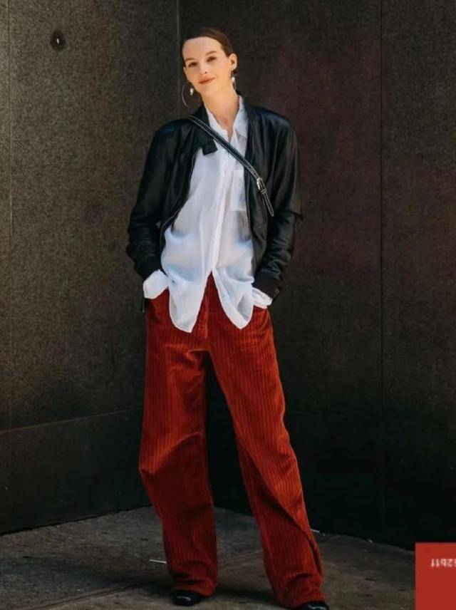 白色衬衫叠穿黑色皮衣,整个造型既带着几分文雅与清新,又拥有了硬朗和帅气,这样的碰撞有着别样的时髦。