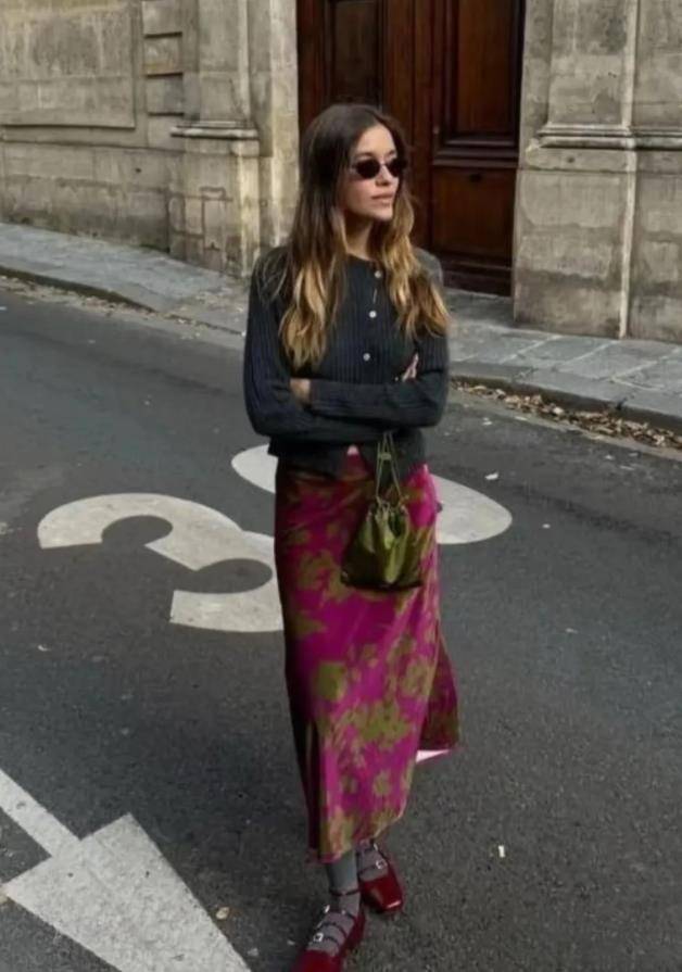 这种深灰色的针织开衫,自带高级感,当然了百搭性也很好,选择玫瑰红的直筒长裙来配,脚上再加上一双红色玛丽珍鞋,利用灰色袜子和上衣进行呼应,细节感很强,整体看起来充满了复古和贵气。