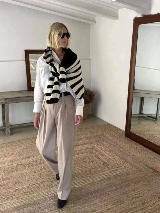 在肩膀上搭配一件黑白条纹针织衫,或者是彩色的毛衣作为点缀,可以化解白衬衫带来的单一感,既保暖又增加了穿搭层次感。