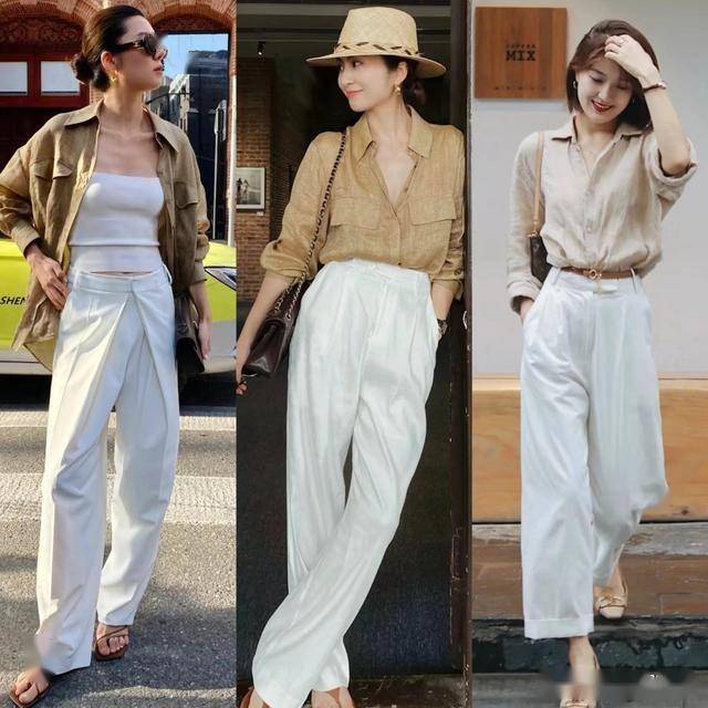亚麻色的衬衫,可以搭配一条白色的阔腿裤,配色显得格外清新自然,有一种老钱风的高级质感,又充满了随性慵懒的风格,很耐看。