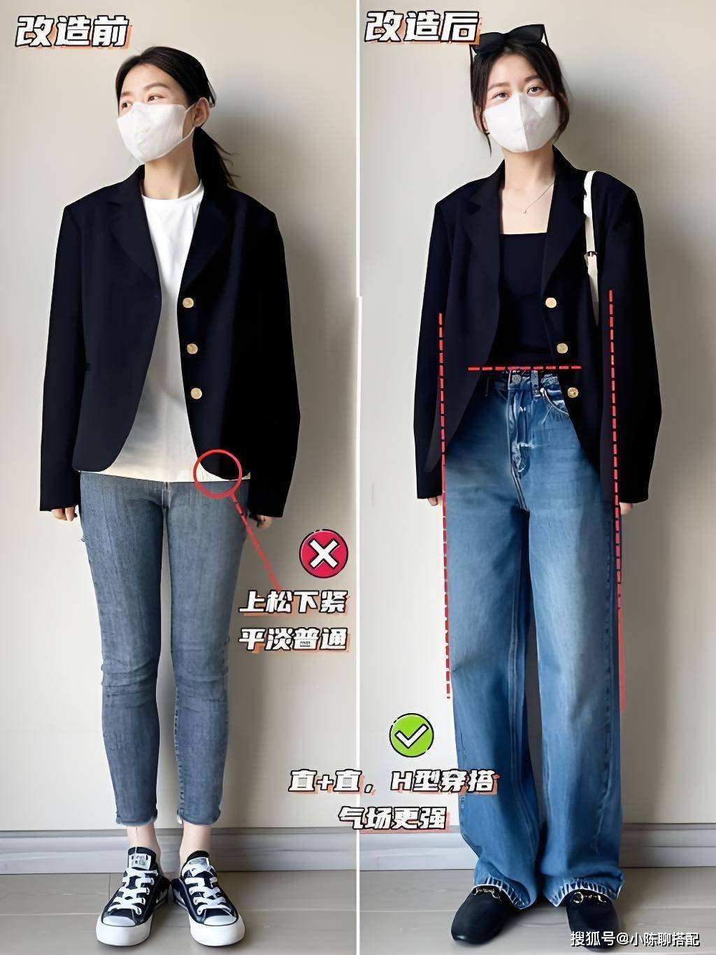 想要穿得好看,关键在于懂得扬长避短。首先第一点就是修饰身材比例的问题,小个子或者身材一般的人,不要追求所谓的松弛感。同样的衣服,在妆造都不变的情况下,仅仅换条裤子,瞬间拉长腿部线条,人不仅看着变高了,最重要的是看着干净利索了。