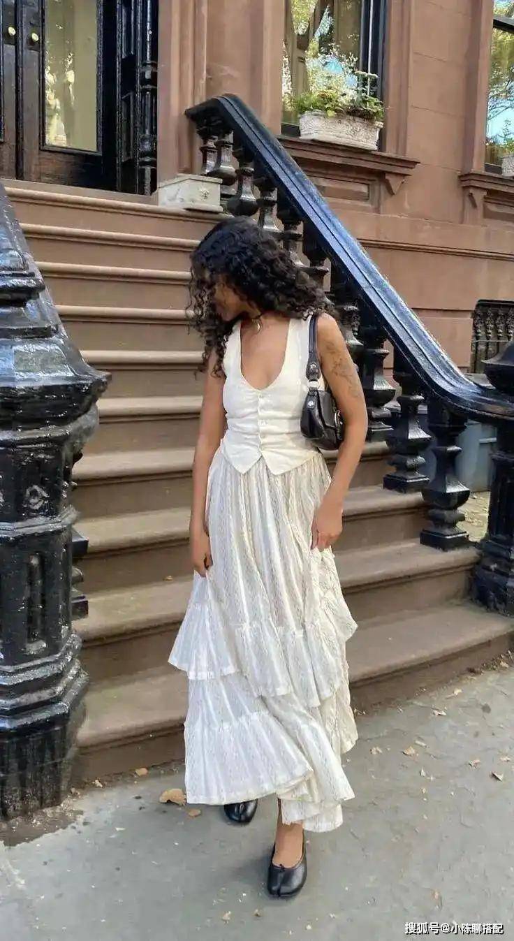蛋糕裙:搭配简洁很柔软的上衣,鞋子要轻巧+清爽,比如普通的白T+小白鞋,或者款式修身的针织衫+平底鞋。