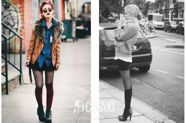 小编在之前讲过袜子叠穿很保暖,很有5050的效果,可中长袜的颜色选择上也不简单。首先选择尽量薄的丝袜这样才能穿出长靴的感觉,其次中长袜的颜色一定要和打底裤袜区分开来,否则只会臃肿。不过这个穿法可不是适合任何人,小腿不直的姑娘们可别轻易尝试哦。