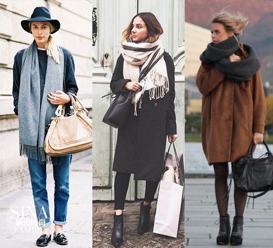 细节方面,可以搭配围巾来增加整体造型的层次感。比较细比较长的围巾可以采用垂挂法和绕圈法,不仅可以包住脖子,下巴,耳朵还能显脸小。