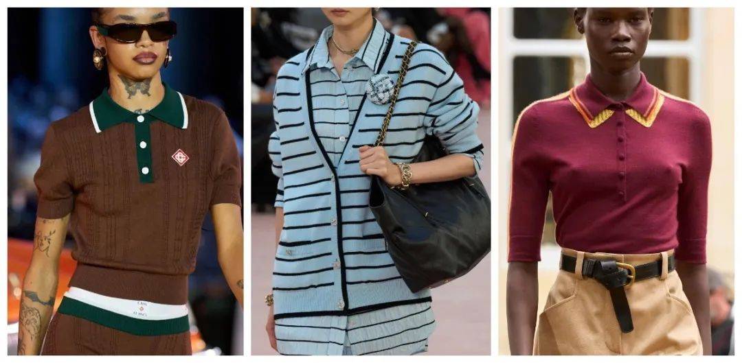 衬衫和Polo 衫在2025 年春夏系列中继续保持连胜势头,多色Polo 衫大多成对出现,相互叠加。Kiko Kostadinov 、Prada 、Chanel 、Versace 和Gabriela Hearst 也喜欢穿有领针织衬衫。在卡萨布兰卡,您可以找到受复古风格启发的模特。