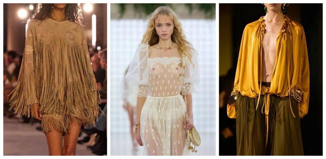 波西米亚风格继续主导时尚之都的秀场和街道,但下一季我们将看到这种趋势更加性感的版本。Chlo é推出的衬衫采用宽大的袖子和精致透明的蕾丝制成的褶边,而Saint Laurent 则借鉴自己的档案,从摩洛哥时代汲取灵感,推出了露出领口的丝绸衬衫。就Alessandro Michele 而言,他为Valentino 设计的首个系列也沉浸在类似的氛围中。模特们穿着腰间系着立领和领口装饰的束腰上衣,在T 台上游行。相反,Isabel Marant 总是以高跟鞋取悦公众,让每一步都为春季造型增添动感。