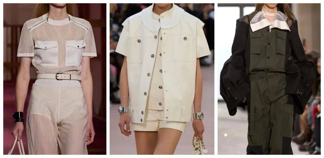 以简单造型和宽敞口袋为特征的实用风格出人意料地主导了爱马仕2025 年春夏系列。它在米色、白色、棕色和粉色的透明短袖和长袖衬衫中占据一席之地,并成套出现。配有安装的裤子Sacai 、Zimmermann 和Chanel 系列中也可以找到带有实用风格缝制口袋的明亮衬衫。