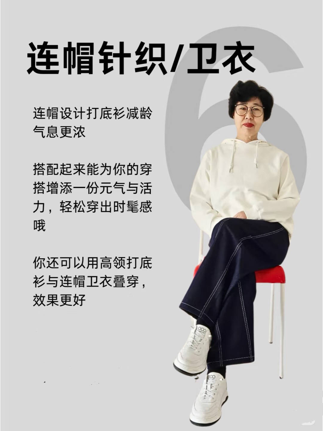 60+的年纪,依然有一颗年轻的心。休闲减龄的穿搭,就更受欢迎。这时候连帽设计的打底衫,就可以产出元气与活力。 连帽卫衣不仅可以单穿,还可用于高领打底衫叠穿,丰富层次感、提升保暖度,让我们的穿搭简洁又时尚 |