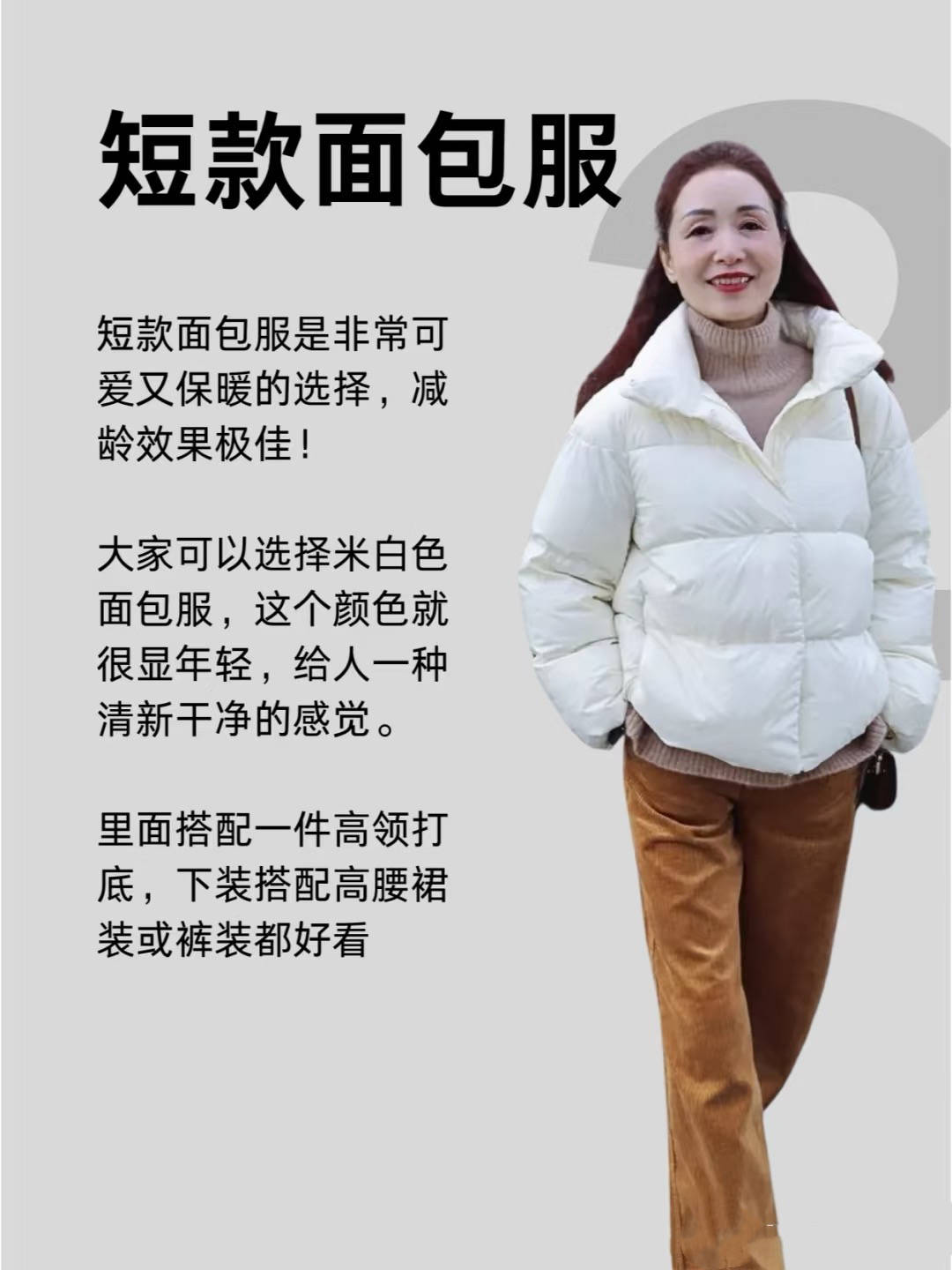 短款的面包服、其实可以让我们的穿搭更加利落、也更保暖。如果你喜欢膨胀感比较强的面包服,就可以配比较修身的打底衫。 当然这种短款的面包服,更适合身材比较苗条的阿姨。当你到了60+的年纪,又想要把自己打扮的时髦洋气一点,就选这种短款的面包服吧。