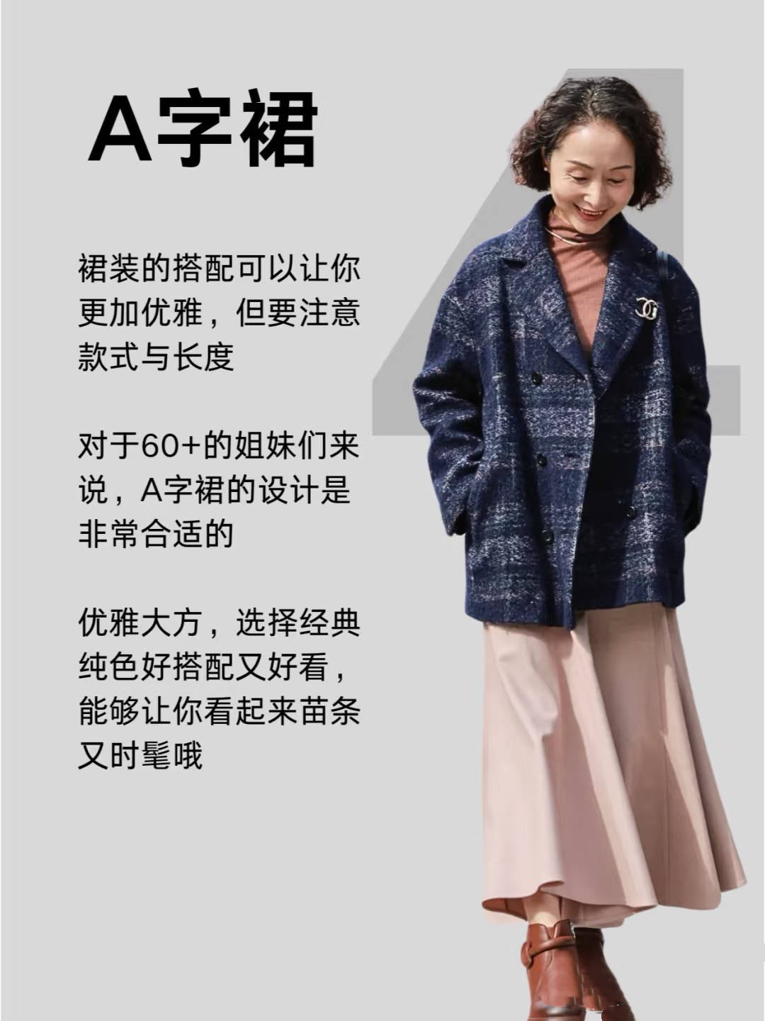 对身材修饰性极强的A字裙,简直就是大龄阿姨的救赎。当我们年龄增大,身体形态的不完美也会愈发的明显。 这时候一条高腰的A字形半身裙,不仅大方洋气、还更加显瘦。A字裙可以选择经典款式、好搭配的纯色,配上短靴会显得身材格外苗条。