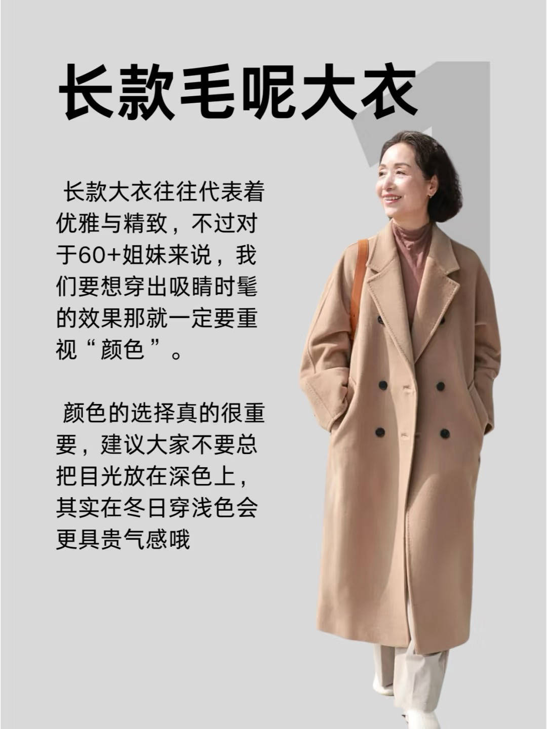 代表着精致与优雅的长款呢大衣,简直就是60+阿姨必备的单品。想要穿得体面知性,就要在款式、色彩、质感上下功夫。 大龄阿姨的毛呢大衣,颜色不必太花哨,以低调高级的色系为主,比如燕麦色、浅咖色、浅驼色、杏色都特别适合春天。