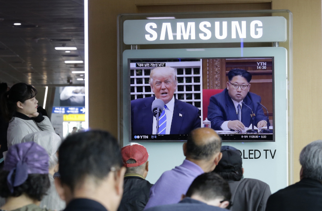韩国首都首尔街头都可见到评论朝鲜半岛局势的电视画面。(美联社)