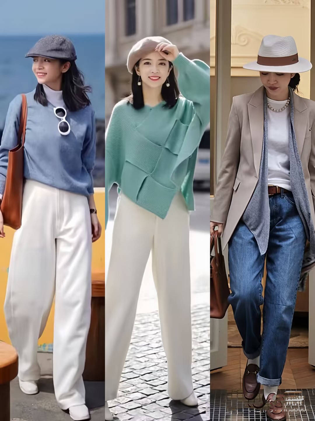 无需花哨、简单即高级 40+的女生,穿衣搭配不需要花哨的图案,也没必要选择太繁琐的设计。我们可以运用时尚简洁的元素,打造属于自己的高级范。 比如色彩上的简洁,目之所及都是大气。浅色系的针织衫/打底衫,随便配一条白色阔腿裤,就体面优雅,是干净又舒适的美。