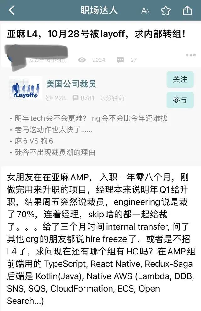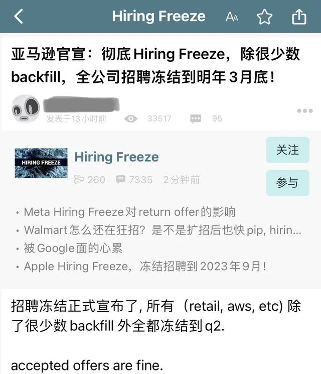看到了inside内网上的memo,大概意思是: 1.Corporate workforce在未来几个月完全停止招聘(估计Warehouse及合同工类的不受影响?)。2.招聘冻结至少持续"next few months",在此期间每个团队只能backfill。